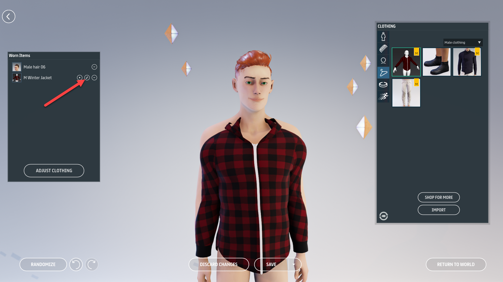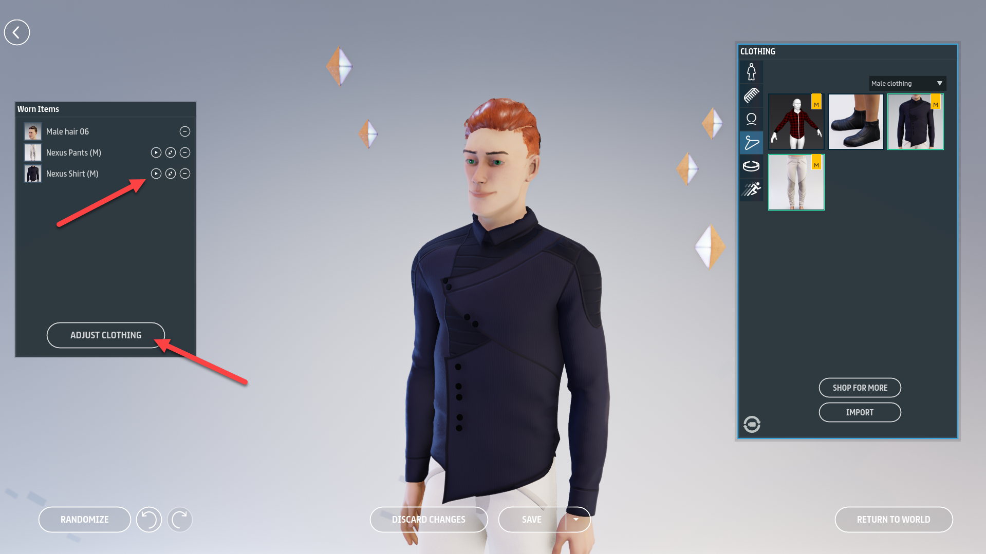 While customizing your look, click the triangular **Play** button next to a clothing item to adjust that item, or click **Adjust Clothing** to adjust all Marvelous Designer clothing on your avatar.