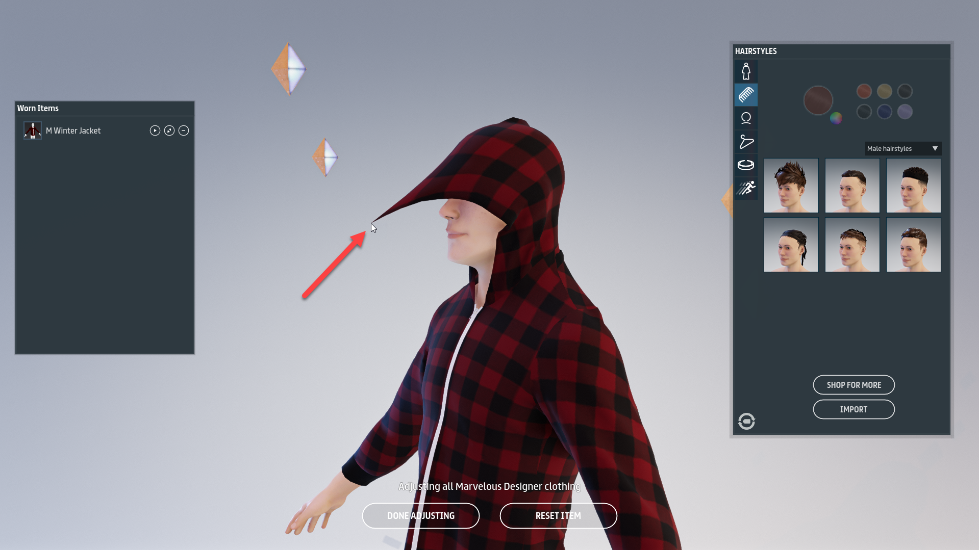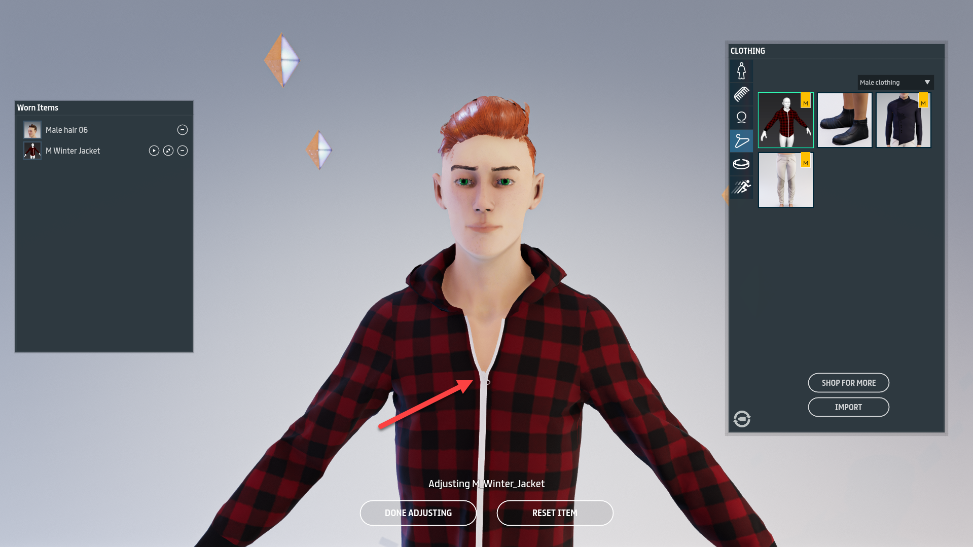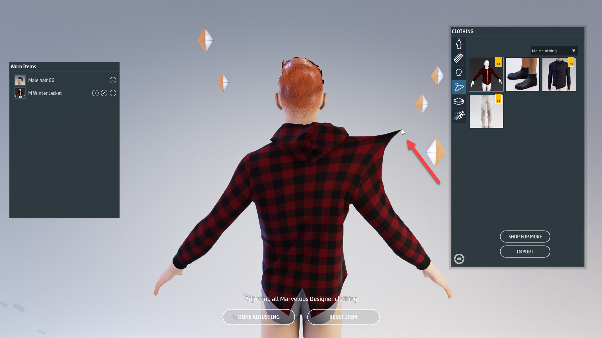 When you are finished adjusting your clothing, click **Done Adjusting** to finalize your clothing adjustments. If you are not happy with the results, you can also click **Reset item** to revert the changes back to the state before you made adjustments. These buttons can be found at the bottom center of the screen in adjust mode.