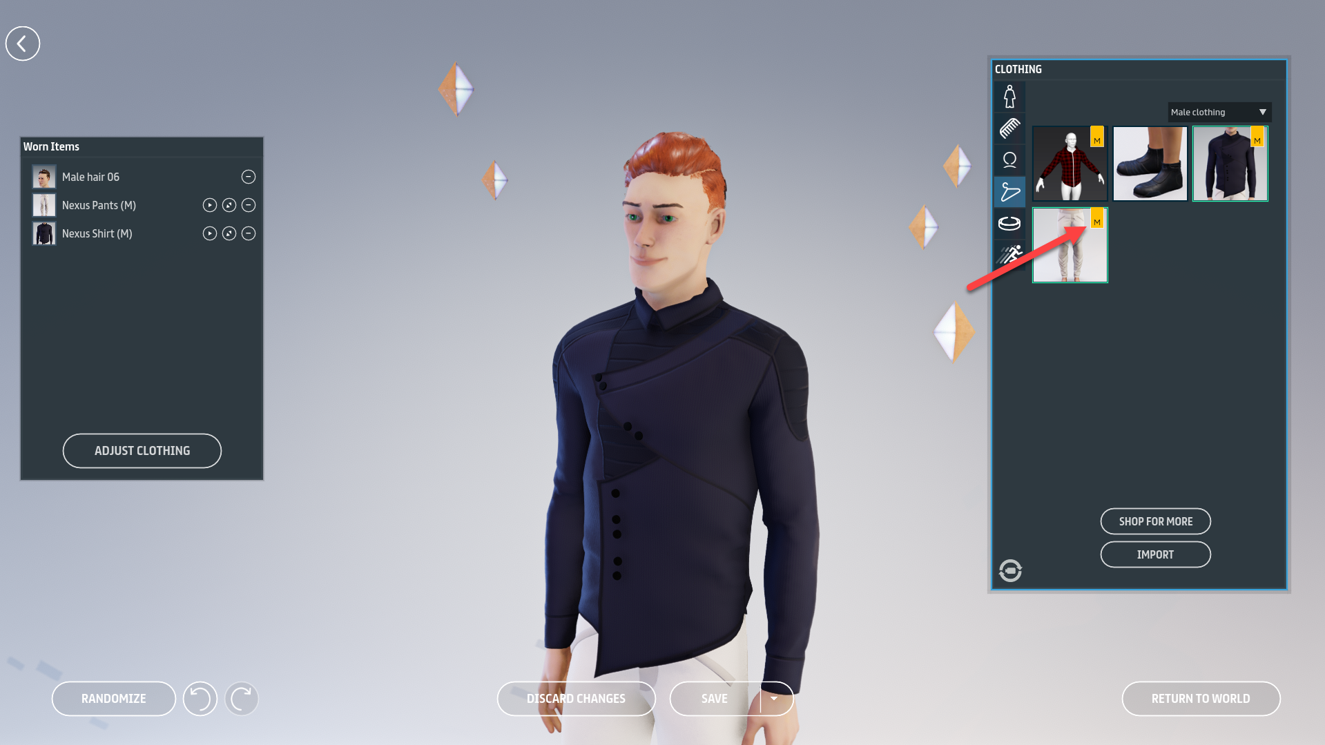 3. Click the **Clothing** tab to view your available clothing. Marvelous designer clothing is marked with a Marvelous Designer "M" logo.