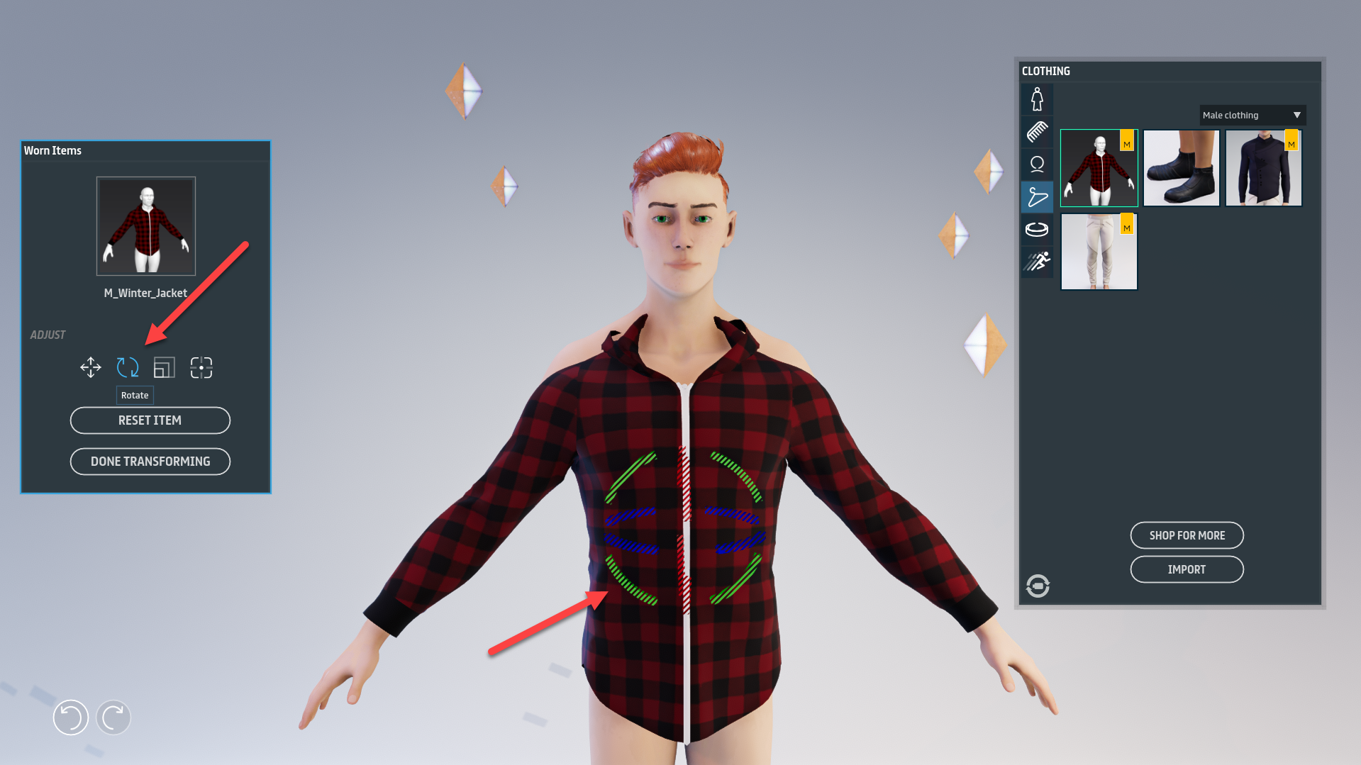 2. To rotate the clothing item, use the **red**, **green**, and **blue** **circles** to rotate the selected object around the object's X, Y, and Z axes.