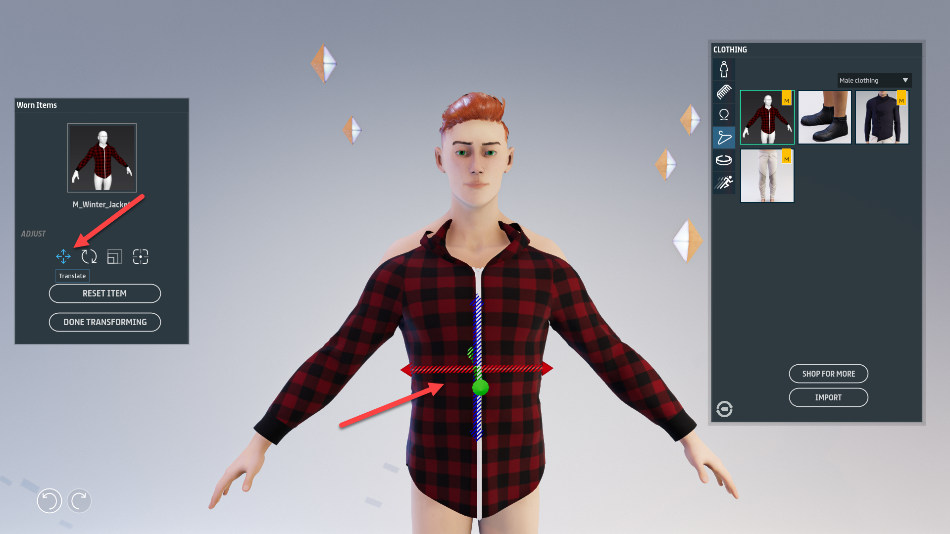 2. To move the clothing item, use the **red**, **green**, and **blue** **arrows** on the gizmo to move the object on the X, Y, and Z axis respectively.