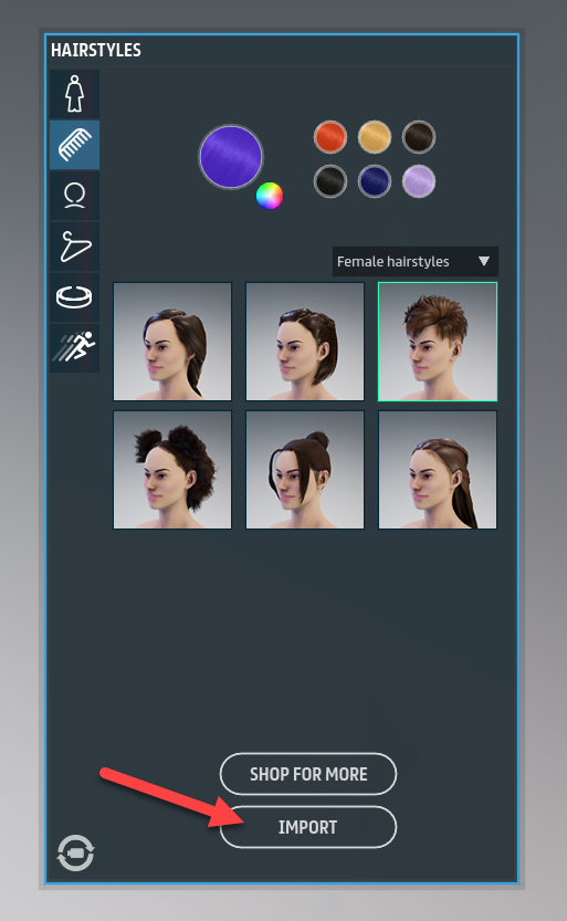 Click the appropriate item tab for the item you want to import: hairstyles, clothing, accessories, and animation.