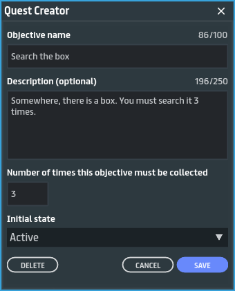 (Optional) Enter a brief Description of the objective (up to 250 characters). This is a good place to add helpful hints or details about the quest.