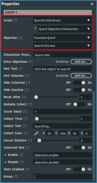 In the object's Properties, under the script section (usually "Script 1" for new objects), choose Quest Script Library from the Script dropdown menu.