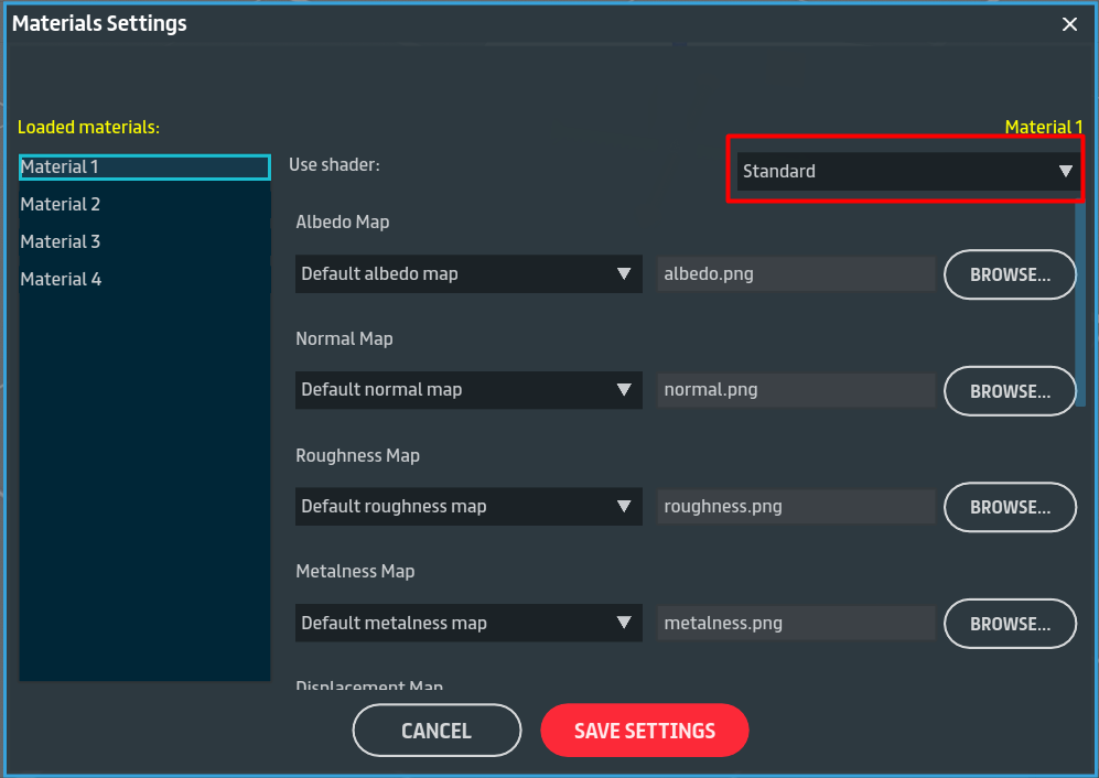 <figure><img src="https://1251409636-files.gitbook.io/~/files/v0/b/gitbook-x-prod.appspot.com/o/spaces%2FeFXiTZShM8YWMV94n1eV%2Fuploads%2Fgit-blob-00f9ae78f279b9b68b1ad6d080a8f5b9bf671fc5%2Fshaderselectbox.png?alt=media" alt="" width="563"><figcaption><p>The left menu is the material slots and the dropdown on the top right is where you select what shader you want to use</p></figcaption></figure>