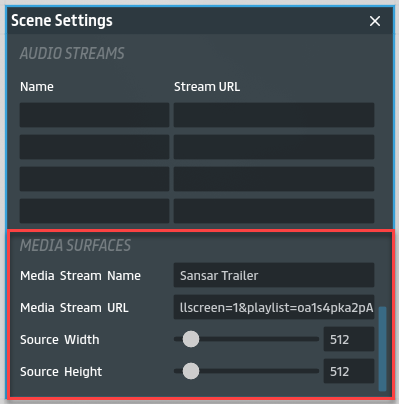 The Media Surface Settings section of the Scene Settings panel allows you to set a media URL and set the location and volume of audio playback in the scene for that media URL.