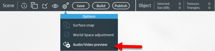 You can preview your audio and media content by toggling Audio/Video preview in the Options menu while editing a scene. For more information on previewing media and audio in your scene, see Previewing audio and video in a scene.