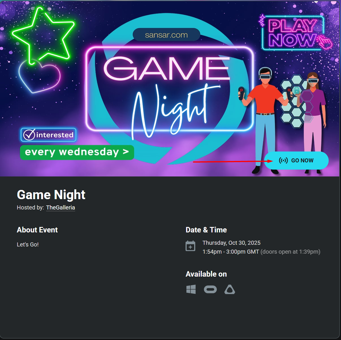 <figure><img src="https://1251409636-files.gitbook.io/~/files/v0/b/gitbook-x-prod.appspot.com/o/spaces%2FeFXiTZShM8YWMV94n1eV%2Fuploads%2Fgit-blob-1bc367304c1edbc9e38f2f3ddaa0335c00c6b9a0%2Fgonowevent.png?alt=media" alt=""><figcaption><p>Click an upcoming event's image or title, then click <strong>Go Now</strong> link to visit the venue.</p></figcaption></figure>