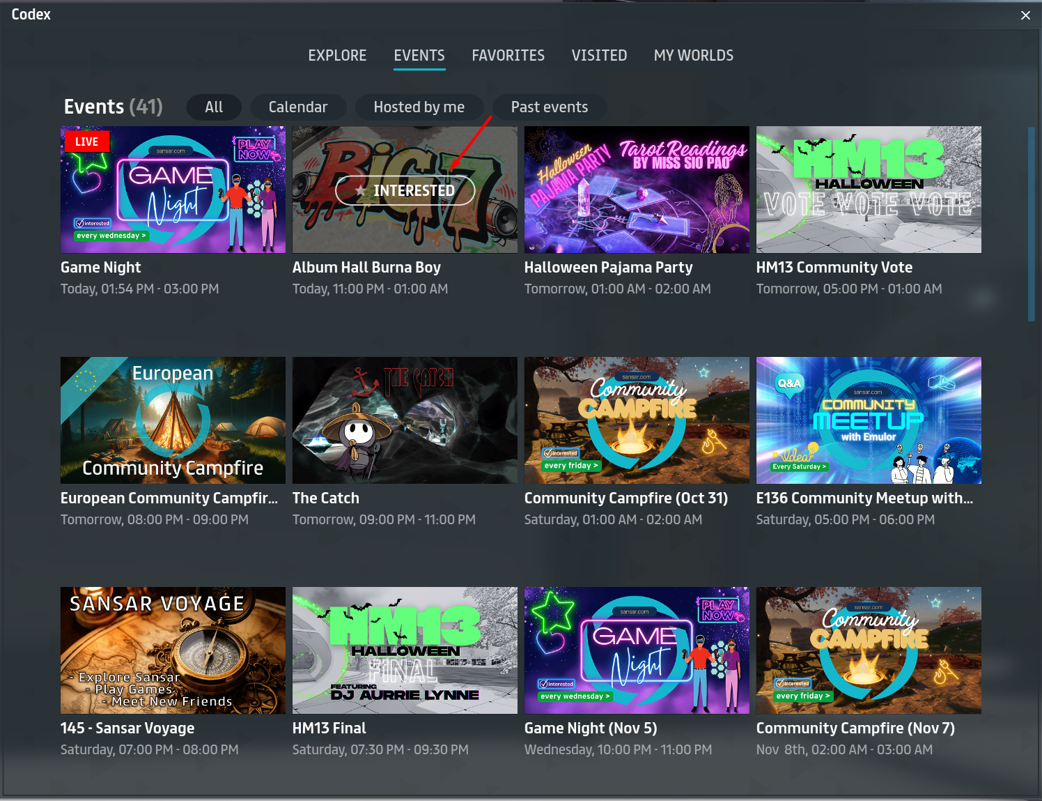 You can add an event to your personal calendar for later reference by clicking the **Interested** button that appears when you move your mouse cursor over the event image. For more information about adding events to your calendar, see [Adding events to your calendar](https://docs.sansar.com/latest/exploring-in-sansar/attending-events/adding-events-to-your-calendar).