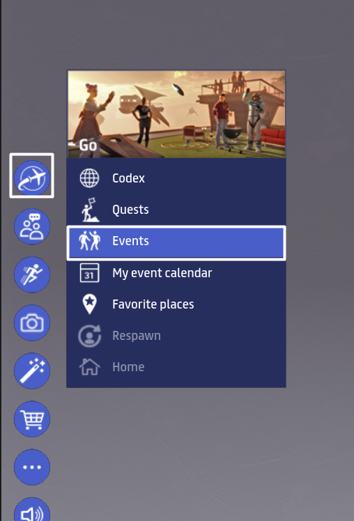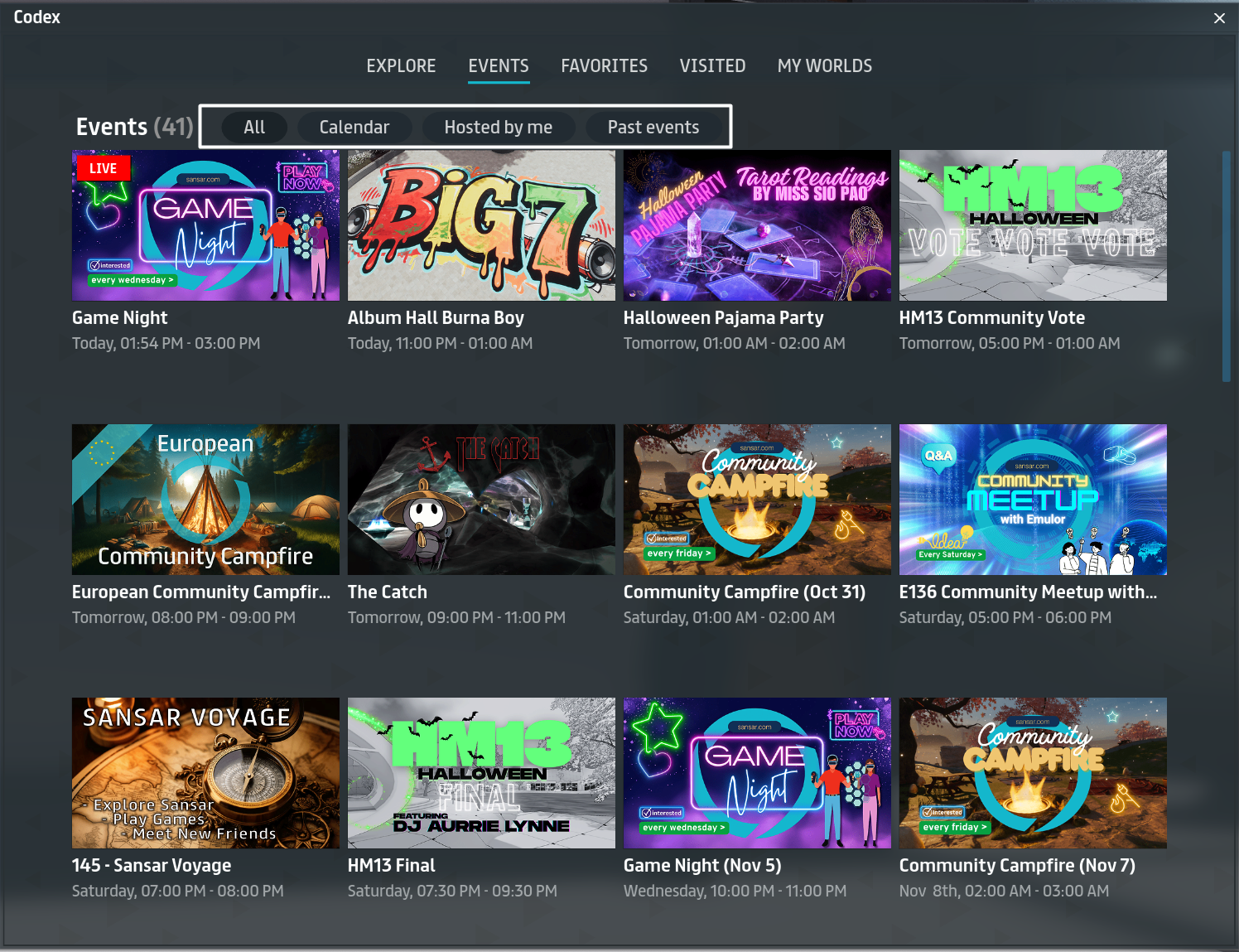 You can use the Events section of the Codex to browse all upcoming events in Sansar. To open the Codex, choose **Go > Events** from the main menu.