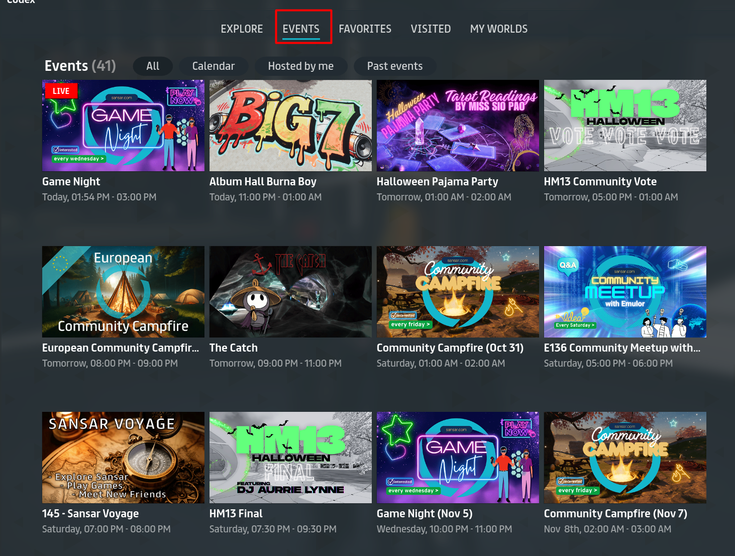 1. Visit the [Events page on the Sansar website](https://www.sansar.com/events) to view all upcoming events.