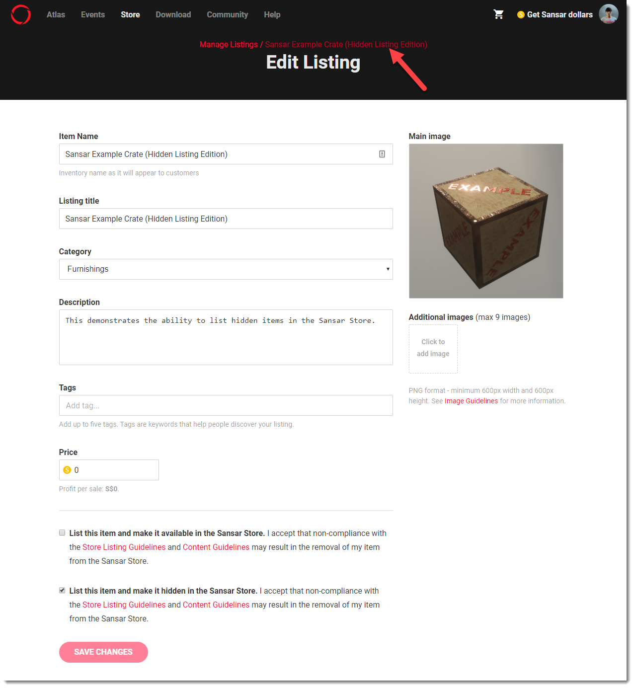 The process of creating a hidden listing is exactly the same as creating any other listing, except for the final step. When you would normally click the checkbox for **List this item and make it available in the Sansar Store**, you can instead click the checkbox for **List this item and make it hidden in the Sansar Store**.