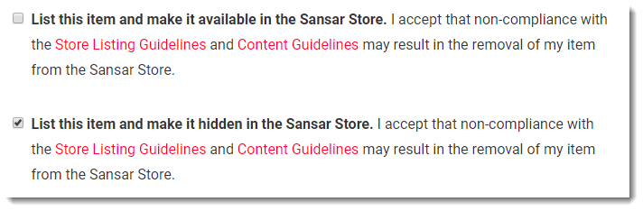 For step-by-step instructions on how to create a listing in the Sansar Store, see [Selling items in the Sansar Store](https://docs.sansar.com/latest/sansarstore/selling-your-content/selling-items-in-store), which includes instructions on creating a hidden listing.