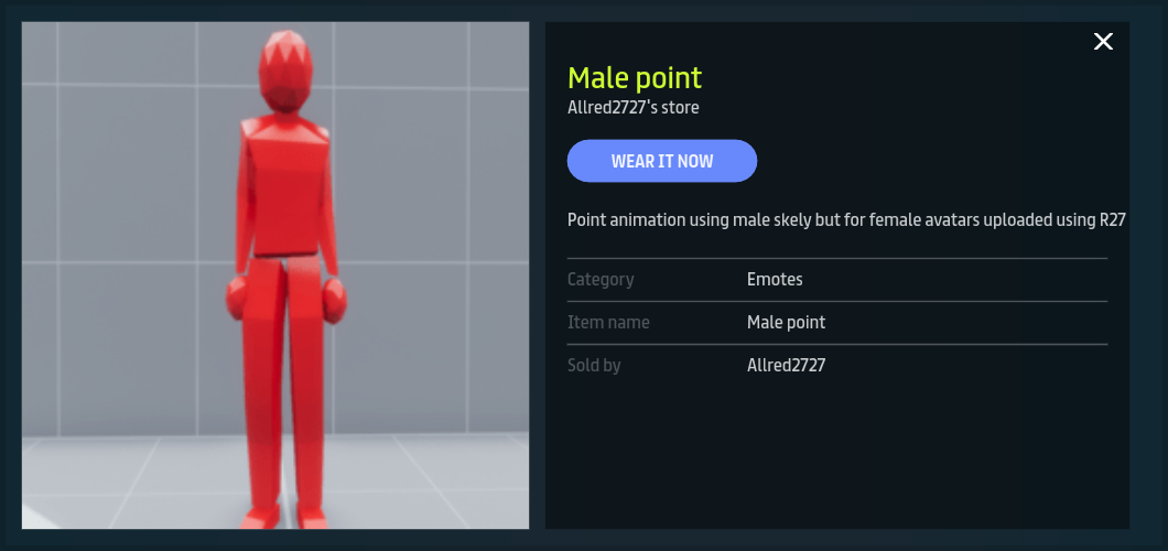 * For items under avatar looks such as avatars, clothing and emotes, the **Buy** button becomes a **Wear it now** button. You can click **Wear it now** to immediately open the avatar editor and wear the item.