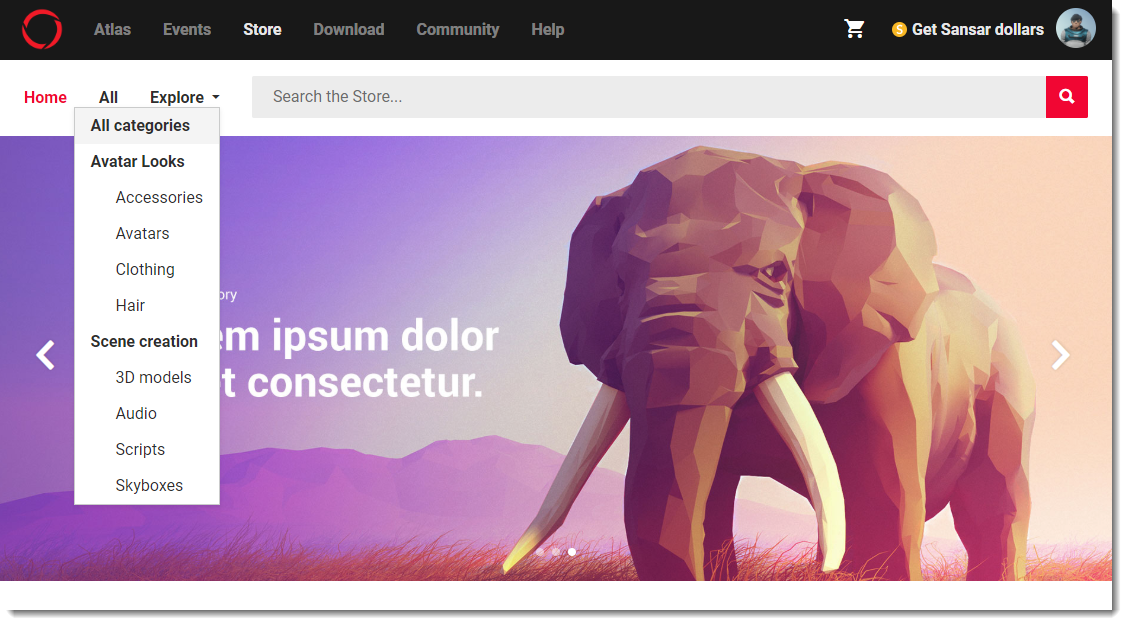 <figure><img src="https://1251409636-files.gitbook.io/~/files/v0/b/gitbook-x-prod.appspot.com/o/spaces%2FeFXiTZShM8YWMV94n1eV%2Fuploads%2Fgit-blob-de4eb1534de81fb711ba37dbea525fa72e0d0a58%2Fsansar-store-03.png?alt=media" alt=""><figcaption><p>Enter search terms in <strong>Search the Store</strong> or click a category from the <strong>Explore</strong> dropdown to find items for your avatar or scene.</p></figcaption></figure>